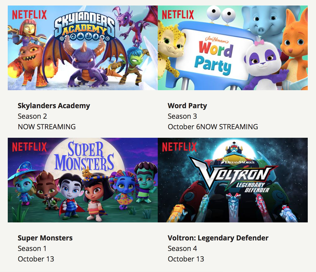 There are so many wonderful shows to watch this month for the little ones. New episodes of Word Party that is now streaming. New this month just in time for Halloween is Super Monsters. For the older kids, blast into action with new seasons of Skylanders Academy and Voltron: Legendary Defender.